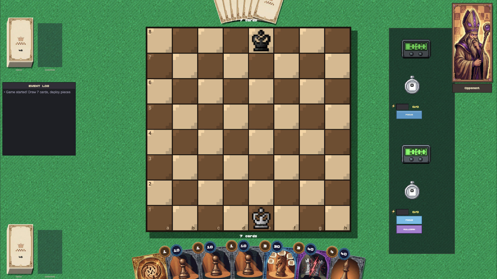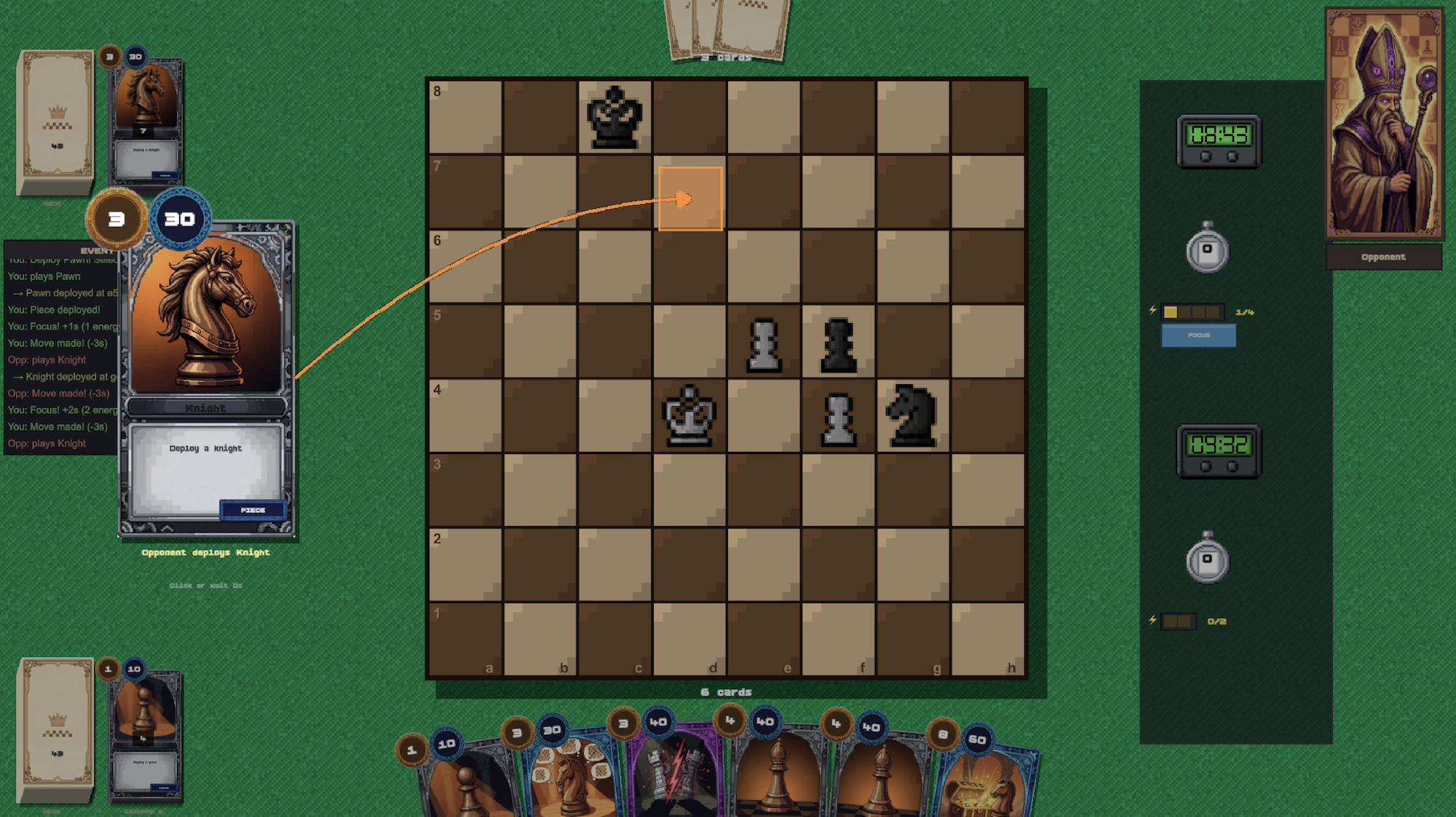Instead of having a full army from the very beginning, you need to deploy your pieces from your hand, and manage the energy and time very well! Don't worry, the chess clock doesn't tick here so you can sit tight and think for you next move carefully!